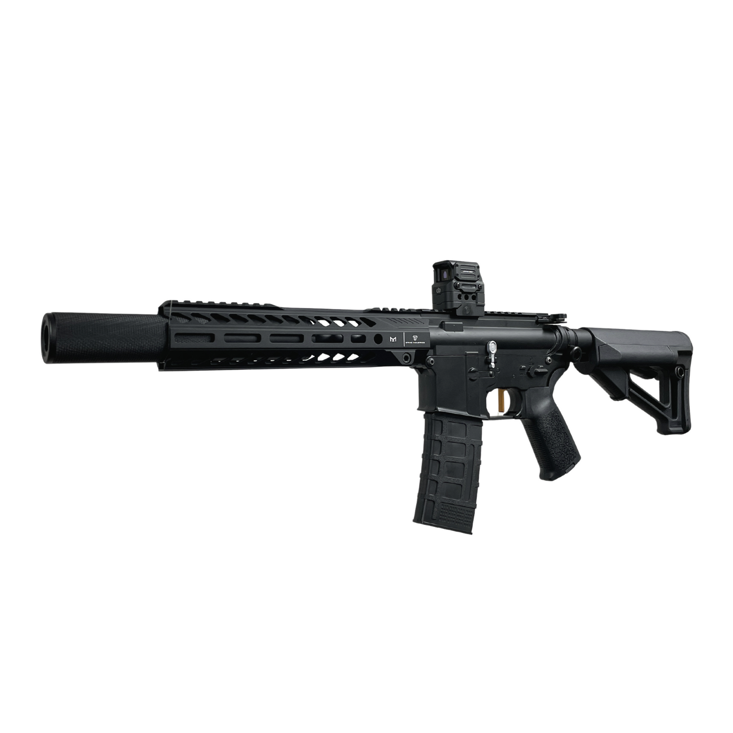 The "Anonymous" M4 custom build is a solid new build we have designed to give a realistic yet custom appearance to differentiate you from all the other M4's out there. The unique parts such as the anodised alloy bolt catch, alloy paddle trigger and the famous Strike Industries handguard really sets you apart from the rest.