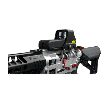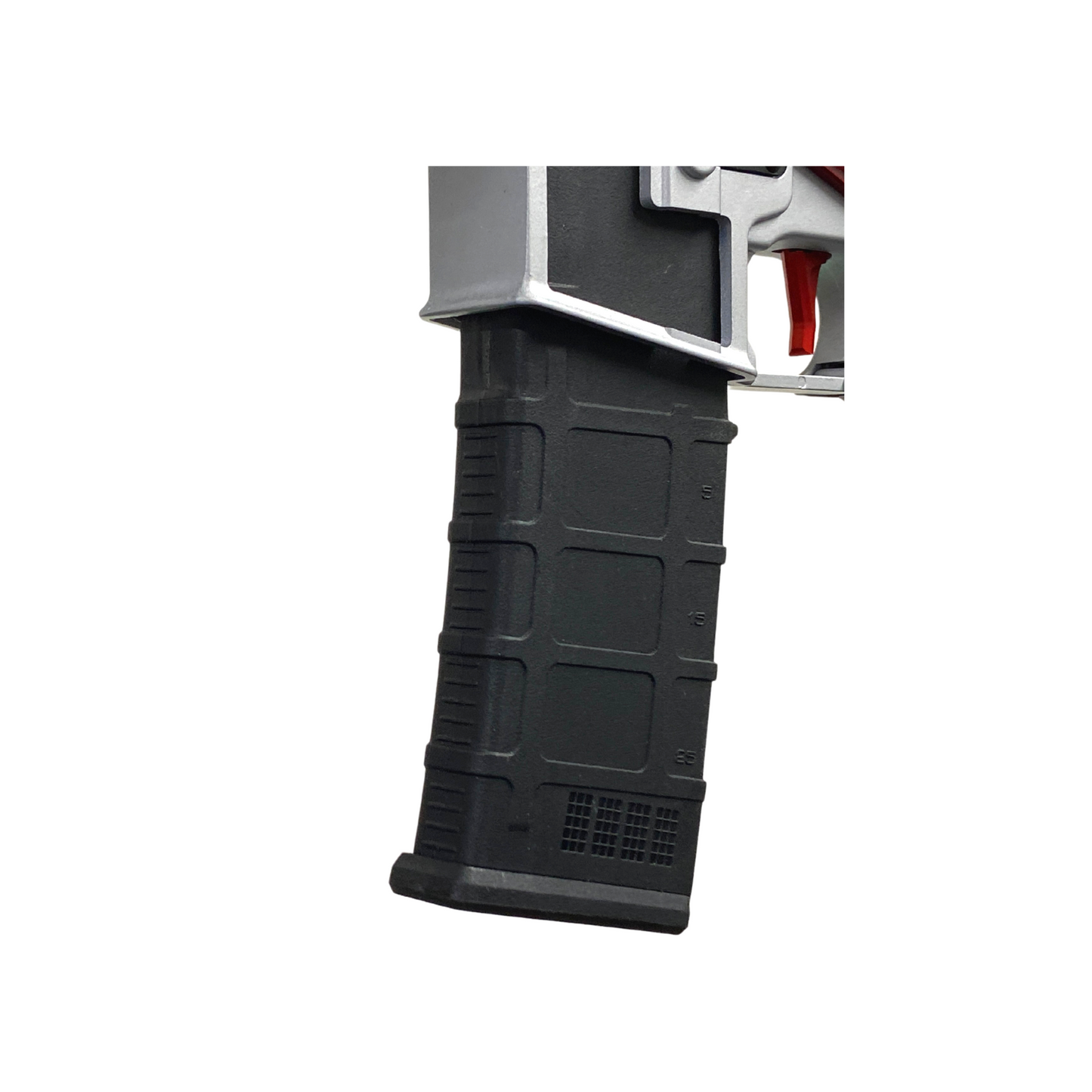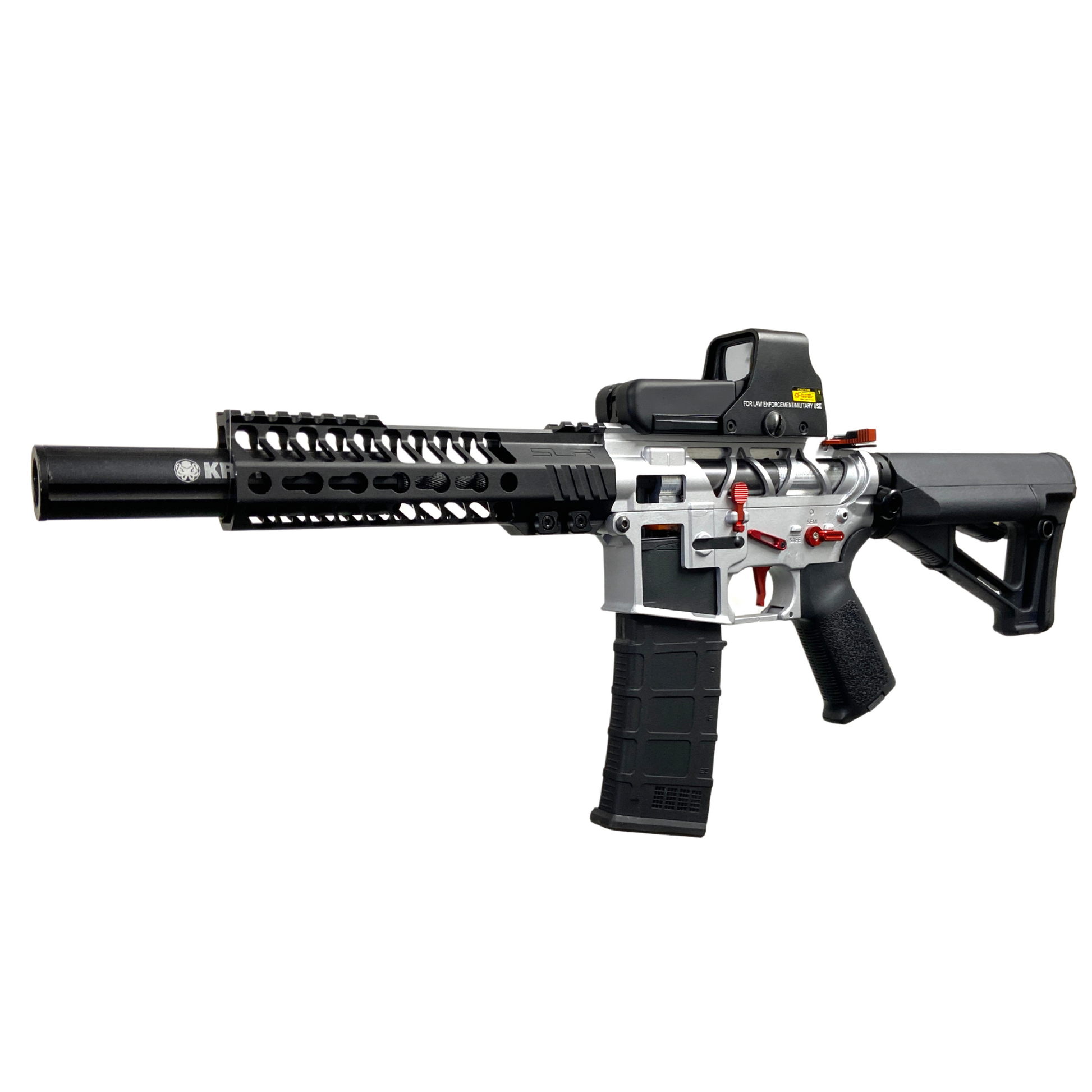 The "Chrome" Metal M4 rifle built by our experienced GBU technicians gives you everything you need in a single rifle. This beautiful piece is loaded with CNC alloy accents to really make this custom build a one off beauty. This is the highest end gel blaster modification we do at GBU. killer CNC hand guard paired with a Alloy suppressor gives it a super clean sporty look and feel. This blaster has the MK Tactical V2 Metal Gearbox housing and the programmable Leviathan V2 FCU... it absolutely packs a punch.