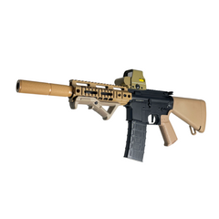 This is the "Bulwark" custom tactical competition rifle. This blaster is made for performance and accuracy to say the least. With a full metal construction, stage 2 comp modification and a full custom aesthetic makes this blaster the most unique and powerful blaster of its kind. Sporting the M4 tan receiver and a tan on black colour scheme you will look like an absolute beast on the field !