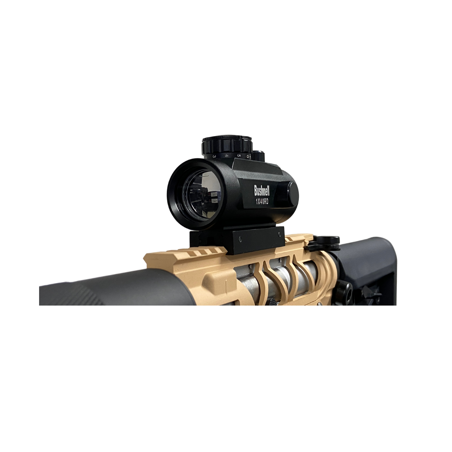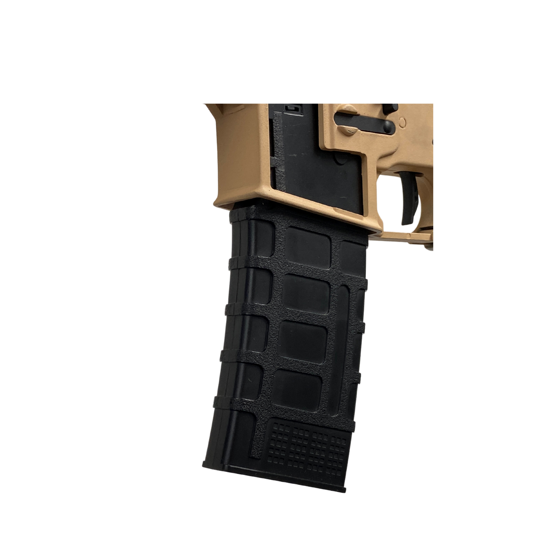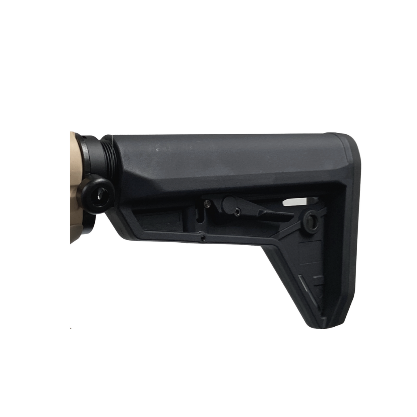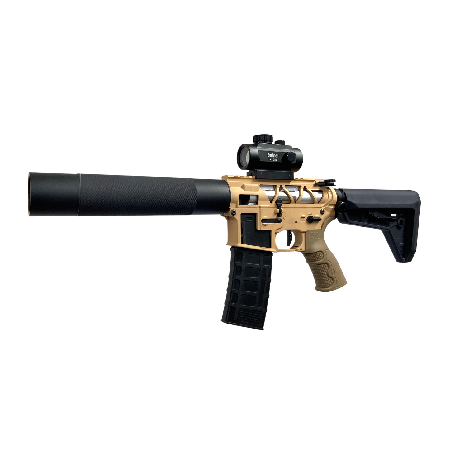 The "M4 Strange" Metal rifle built by our experienced GBU technicians gives you everything you need in a single rifle. A killer CNC hand guard paired with a custom GBU receiver & a painted V2 Gearbox & Navy seal suppressor to give it a super clean sporty look and feel. This blaster has a Fully modified V2 Metal gearbox and it absolutely packs a punch.