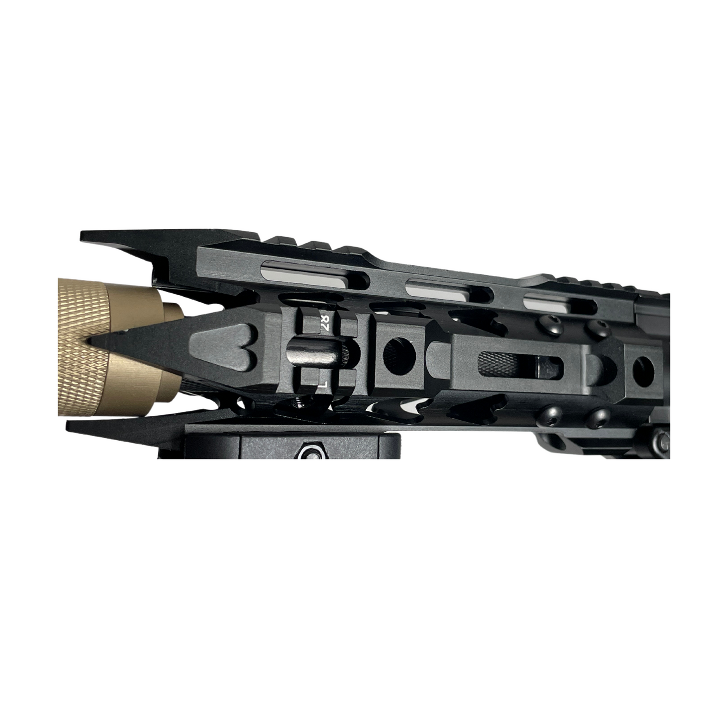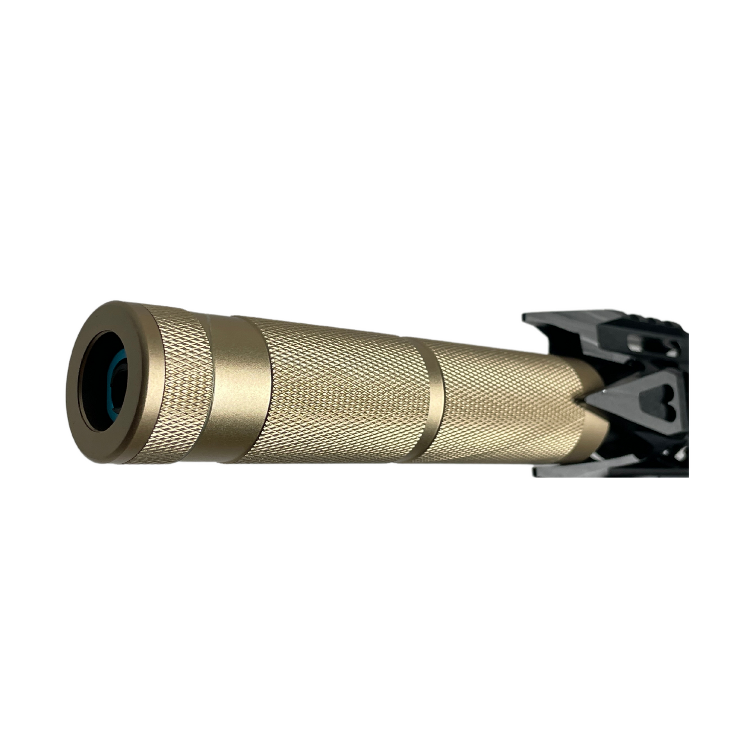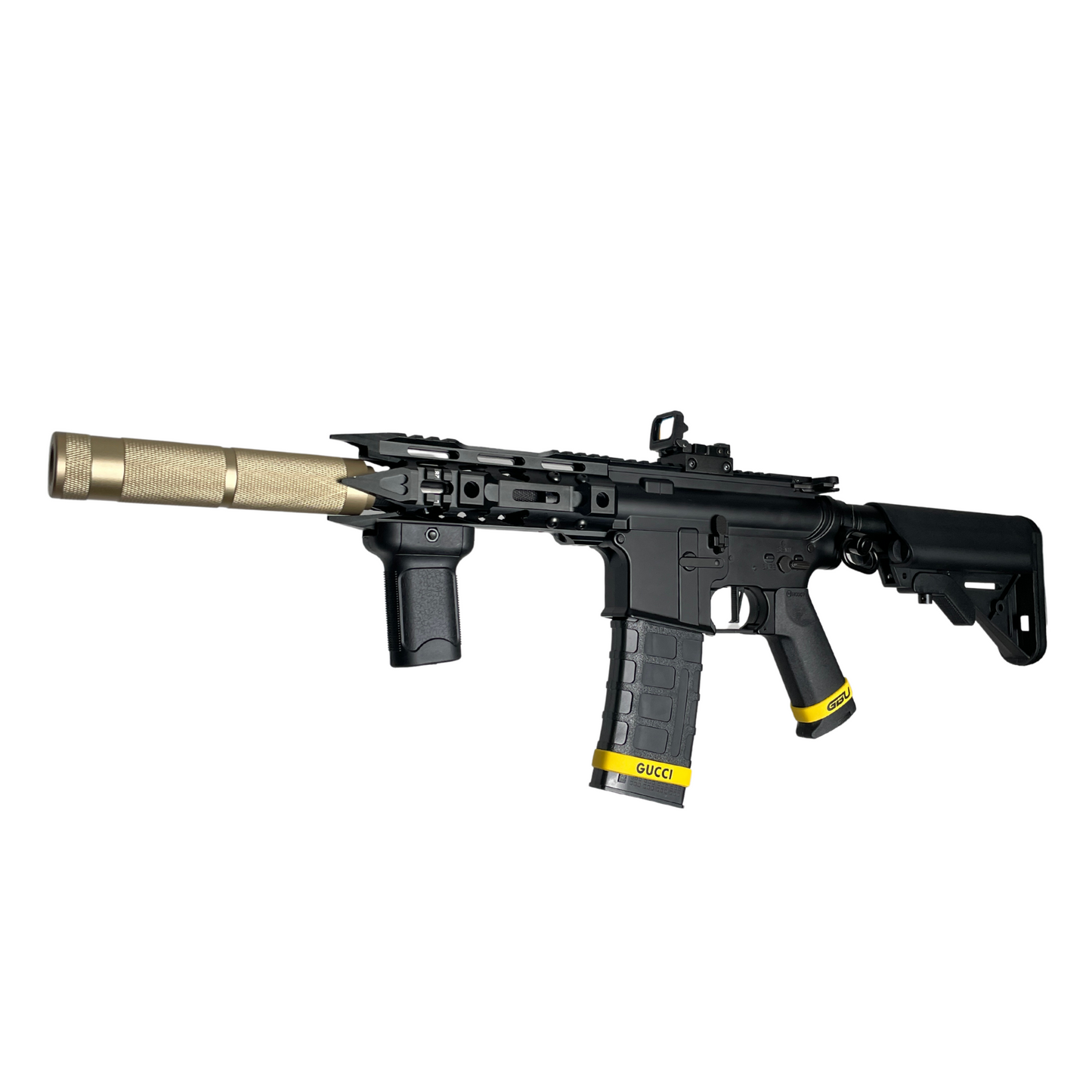 Sporting a gold suppressor tied in with a 7" striker handguard makes this beast look super aggressive and definitely something your friends don't want to get in the way of.