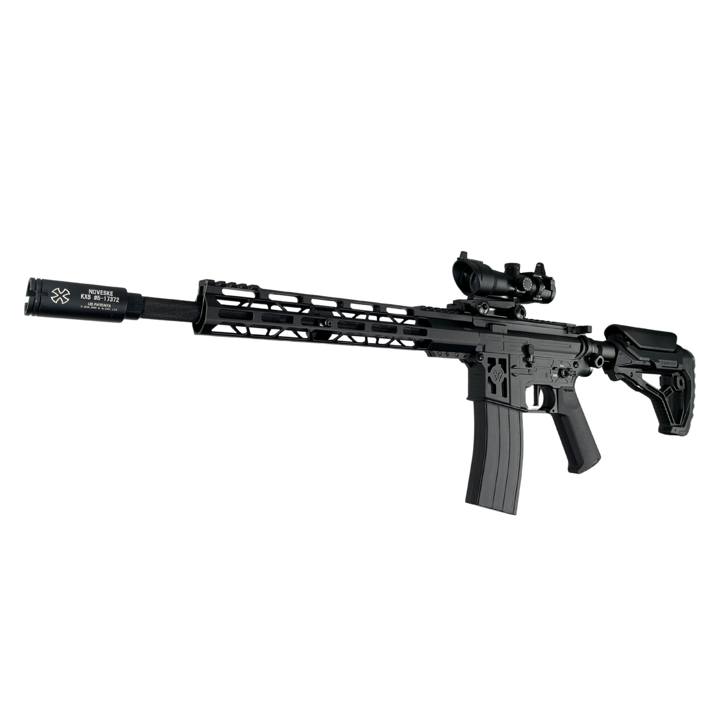 Featuring an 11" Aluminium hand-guard paired with an all metal outer barrel and a KX-5 Flash hider makes a perfect long build with a staggering shooting power of 330+.