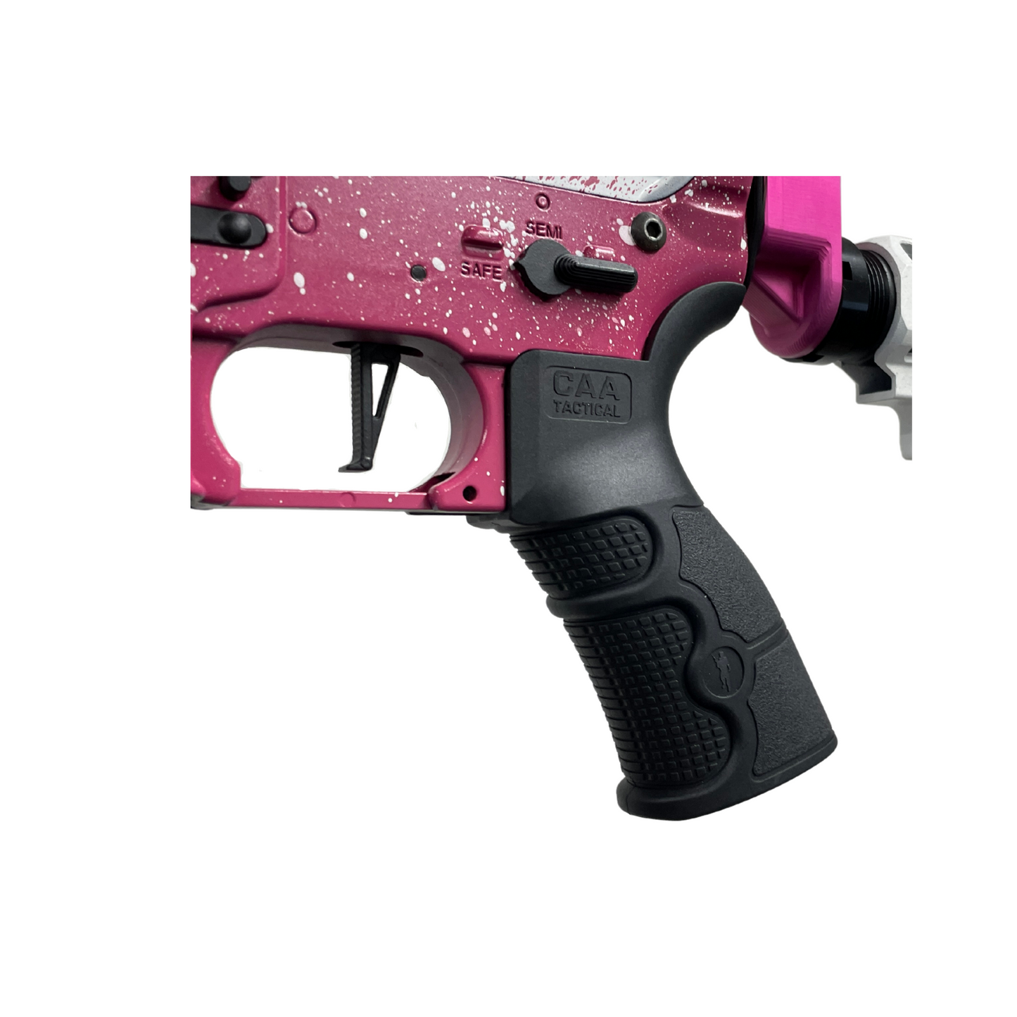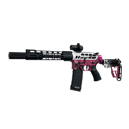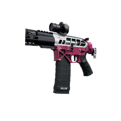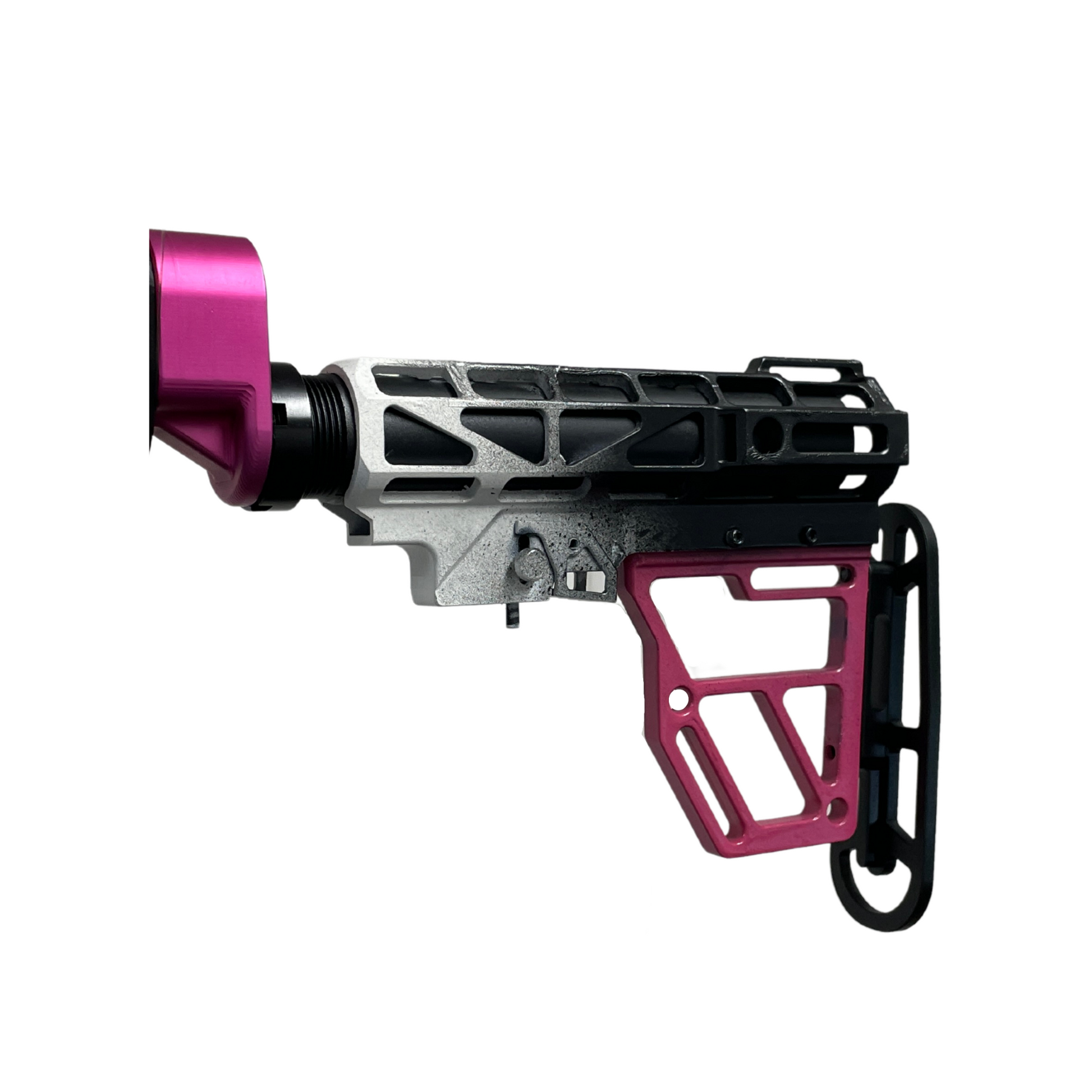 The "Jelly Baby" Custom its a very unique piece and is one of the most eye catching blasters we have created to date. From the colour coordination to the CNC drop stock, this blaster has it all and it is absolutely beautiful. With a custom painted receiver and skeleton buttstock, this is definitely something you will want if you're after attention!