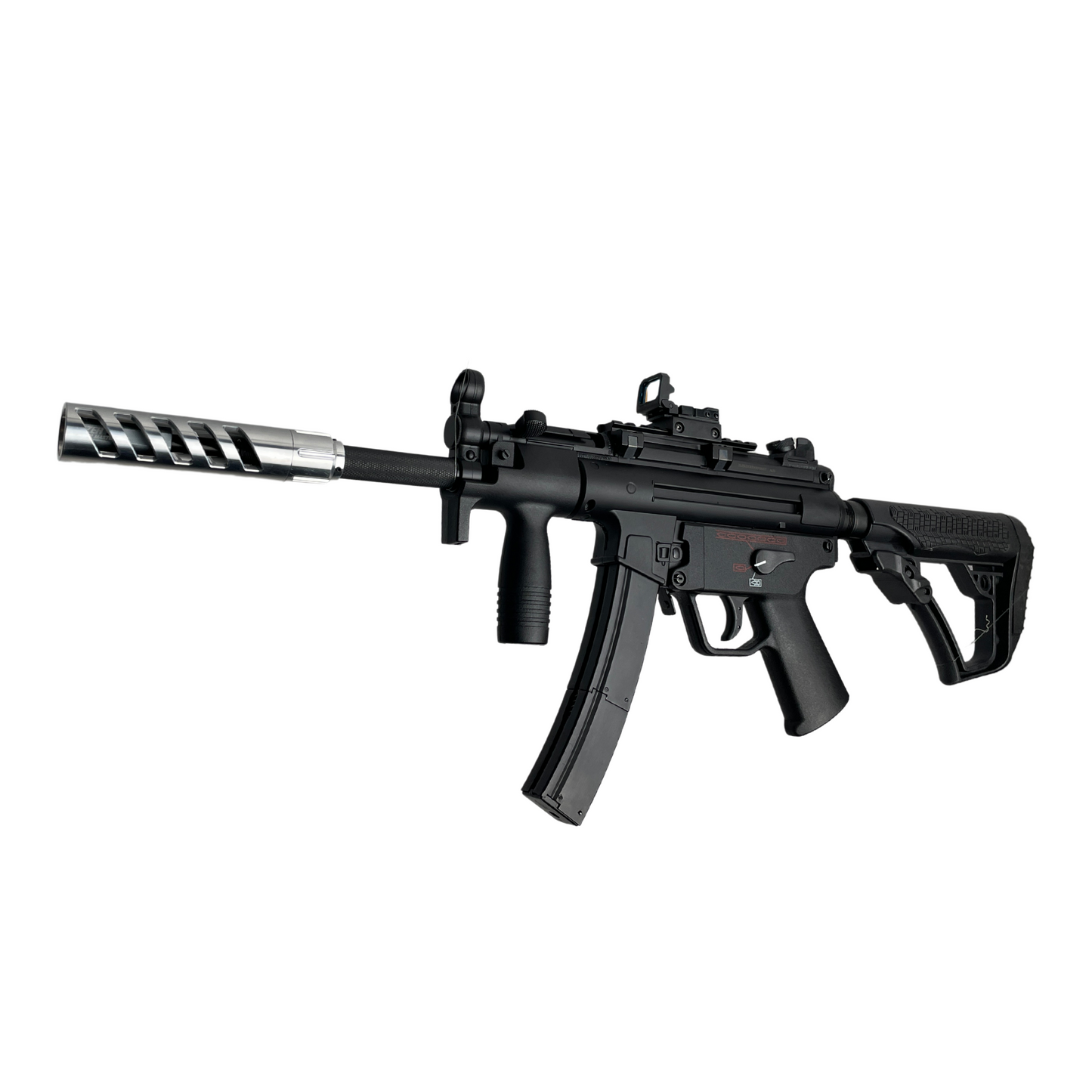 Welcome to the custom "Stalker" MP5K. A beautiful and aggressive gas blaster that is nothing less than perfect. Shooting at an insane 340+ feet per second with an extended alloy barrel, this gas MP5 is one of the hardest hitting gas blasters in the industry.
