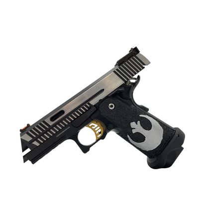 This custom Star Wars Rebel Alliance themed 5.1 Hi-Capa is solid and has the performance you'd wish for. With a polished top slide and a custom Cowcow trigger paired with some great aesthetic modifications, this is definitely a pistol you would want in your armoury.