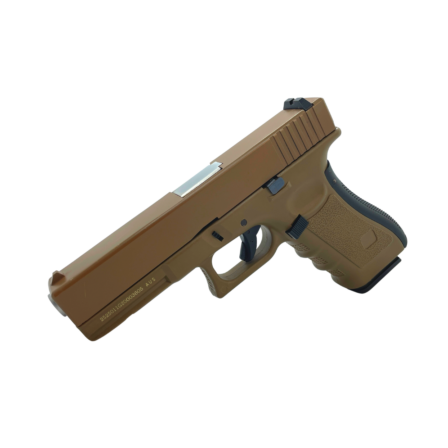 This is the "Tan Commando" G18 gas blowback pistol. This pistol has a full metal construction and is built for power and the real feel experience. Sporting an upgraded recoil spring for enhanced blowback power and an aluminium inner barrel, this pistol is overall solid and high performing to say the least!